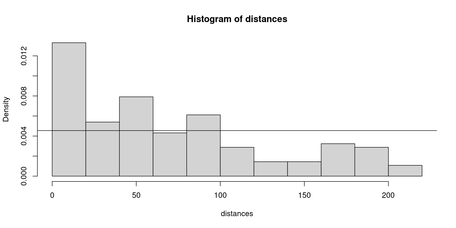 I’m sure this is no surprise, given that detection of the water deer clearly declines in a curve with distance from the transect, rather than remaining constant!