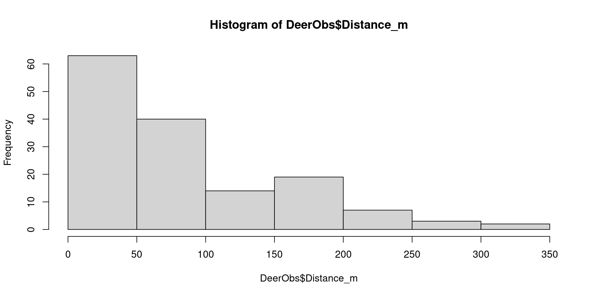 hist (DeerObs$ Distance_m) # Histogram of distances to sightings